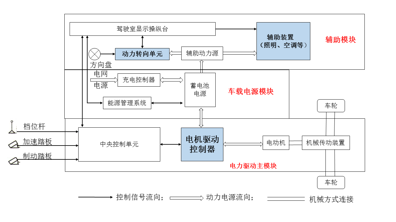 電動汽車的組成包括:電力驅(qū)動及控制系統(tǒng)、驅(qū)動力傳動等機械系統(tǒng)、完成既定任務(wù)的工作裝置等。其中電機驅(qū)動及控制系統(tǒng)是新能源汽車車輛行駛中的主要執(zhí)行結(jié)構(gòu),是新能源汽車的核心部件(電池、電機、電控)之一,其驅(qū)動特性決定了汽車行駛的主要性能指標。